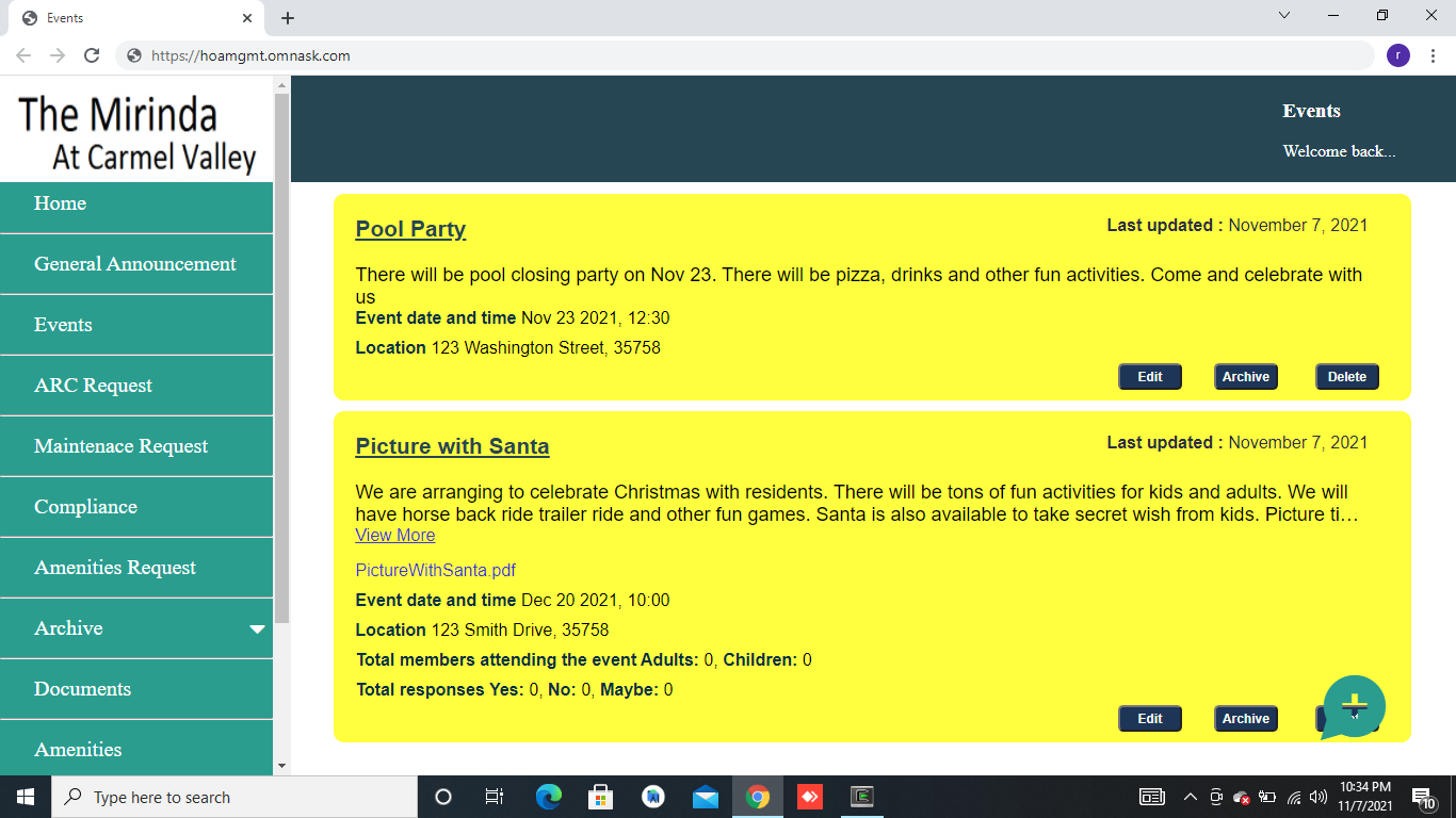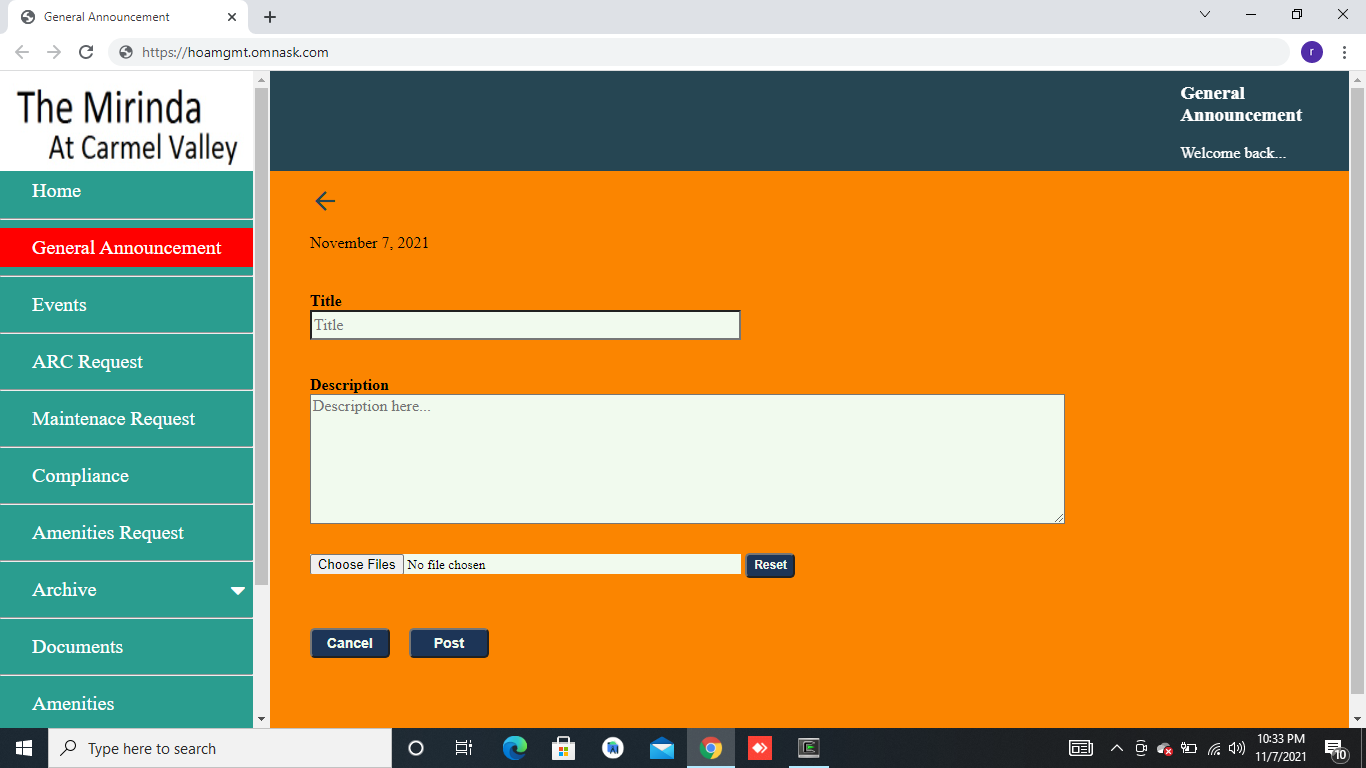 Web app has multiple features like creating General Announcements, Events, Documents, Amenities and more.
