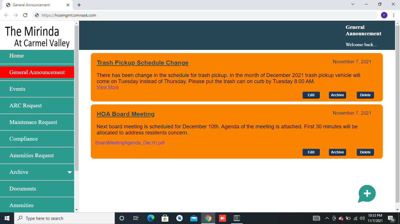 HOA management/Board members can broadcast messages or reply to a request to residents.