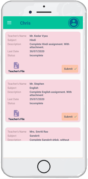 ParentsView provide an option for uploading completed homework/assignment. Parents can view the status of their child(ren)'s homework/assignment.